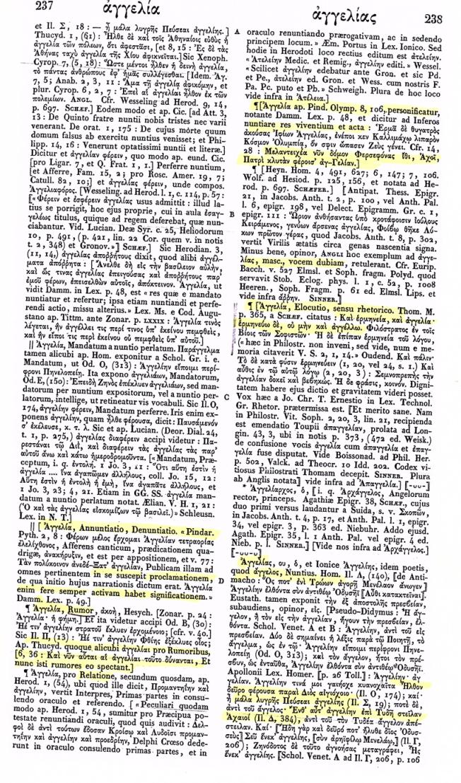 A .messenger, envoy, Il.2.26, etc.; “δι᾽ ἀγγέλων ὁμιλέειν τινί” Hdt.5.92.ζ́, cf. SIG229.25 (Erythrae):— prov., Ἀράβιος ἄ., of a loquacious person, Men.32. 2. generally, one that announces or tells, e.g. of birds of augury, Il.24.292,296; Μουσῶν ἄγγελος, of a poet, Thgn.769; “ἄγγελε ἔαρος . . χελιδοῖ” Simon.74; ἄ. ἄφθογγος, of a beacon, Thgn.549; of the nightingale, ὄρνις . . Διὸς ἄ. S.El.149: c. gen. rei, “ἄ. κακῶν ἐμῶν” Id.Ant.277; “ἄγγελον γλῶσσανλόγων” E.Supp.203; “αἴσθησις ἡμῖν ἄ.” Plot.5.3.3; neut. pl., “ἄγγελα νίκης” Nonn.D.34.226. 3. angel, LXX Ge.28.12, al., Ev.Matt.1.24, al., Ph.2.604, etc. 4. in later philos., semi-divine being, “ἡλιακοὶ ἄ.” Jul.Or.4.141b, cf. Iamb.Myst.2.6, Procl. in R.2.243K.; “ἄ. καὶ ἀρχάγγελοι” Theol.Ar.43.10, cf. Dam.Pr.183, al.: also in mystical and magical writings, Herm. ap. Stob.1.49.45, PMag.Lond.46.121, etc. II. title